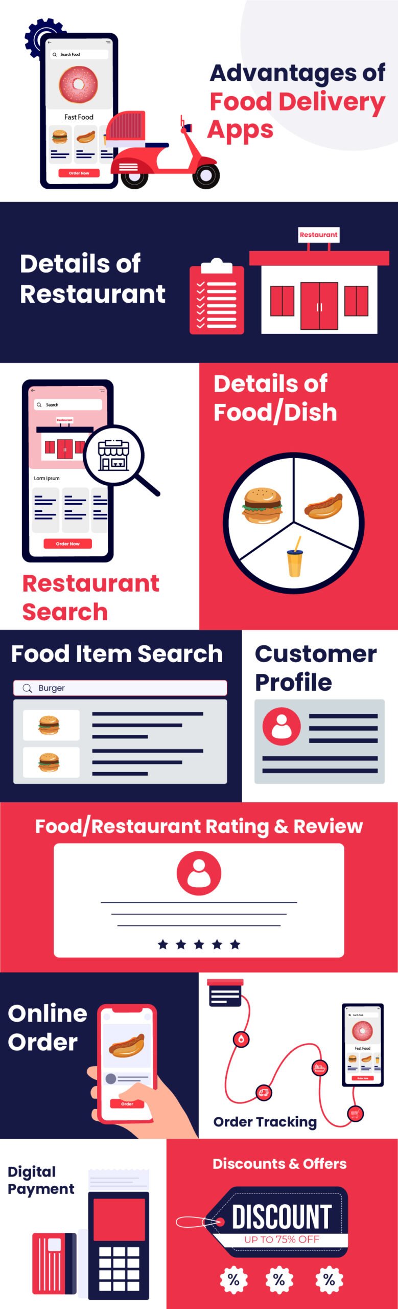 • Discounts & Offers – Food ordering and delivery applications offer great discounts and offer to users occasionally as well as off-season.